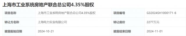 乐居财经 张林霞 10 月 21 日,上海电力实业有限公司挂牌转让上海工业系统房地产联合总公司 4.35% 股份,转让底价为 2277 万元。