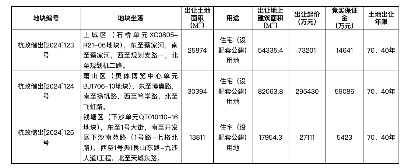 根据地块转让信息,本次转让的三块地块均位于上城区、萧山区、钱塘区。本次上市转让宗地实行自由价格,竞争对手按照价格最高者获得的原则确定。