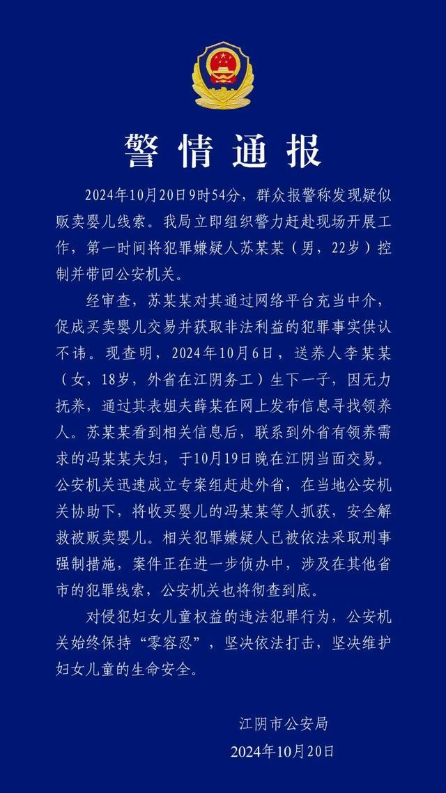 2024 年 10 月 20 日 9 时 54 分,群众报警称发现疑似婴儿销售线索。江苏省江阴市公安局立即组织警力赶赴现场开展工作,第一时间苏某某(男,222)犯罪嫌疑人 岁)控制并带到公安部门。