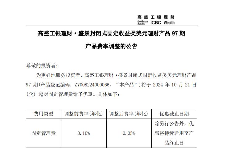高盛工银理财发布公告称,其高盛工银理财、盛景封闭式固定收益类美元理财产品97 将于10月21日(含) 对固定管理费给予优惠,费率由0.1%降至0.05%。