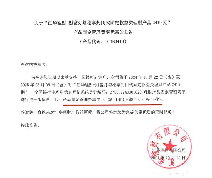 汇华理财旗下还有多种产品降费。在这些产品中,汇华理财-财富灯塔稳享2408期封闭式固定收益理财产品,汇华理财产品-自2024年10月22日(含)至2025年5月14日(含),财富灯塔稳享封闭式固定收益类理财产品2419期等产品的固定管理费率,从年化0.1%降至年化0.00%。