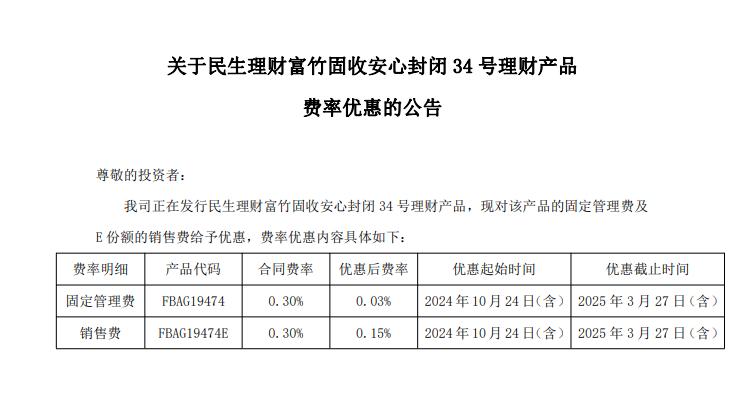 10月17日,民生理财发布公告称,将对34号理财产品的固定管理费和E份额的销售费给予优惠,这些产品正在发行。其中,固定管理费由0.3%降至0.03%。;销售费用由0.3%降至0.15%。优惠起止时间为2024年10月24日(含)至2025年3月27日(含)。