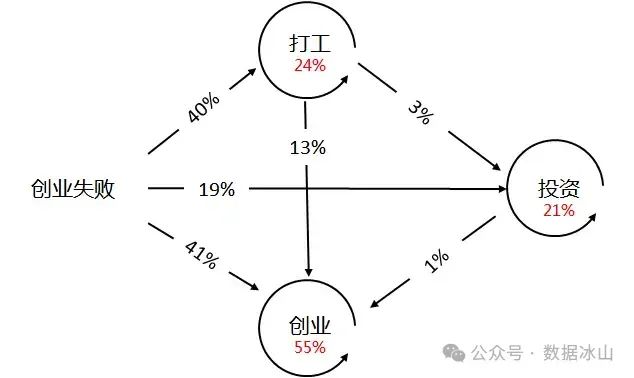 最早在知乎有一篇热门文章,用大数据和马尔科夫链详细分析统计了创业者失败后会做什么(详见下图)。时隔多年,也值得狗尾续貂。在这个告别双创的时代,我们来看看企业家的现在、昨天和明天。