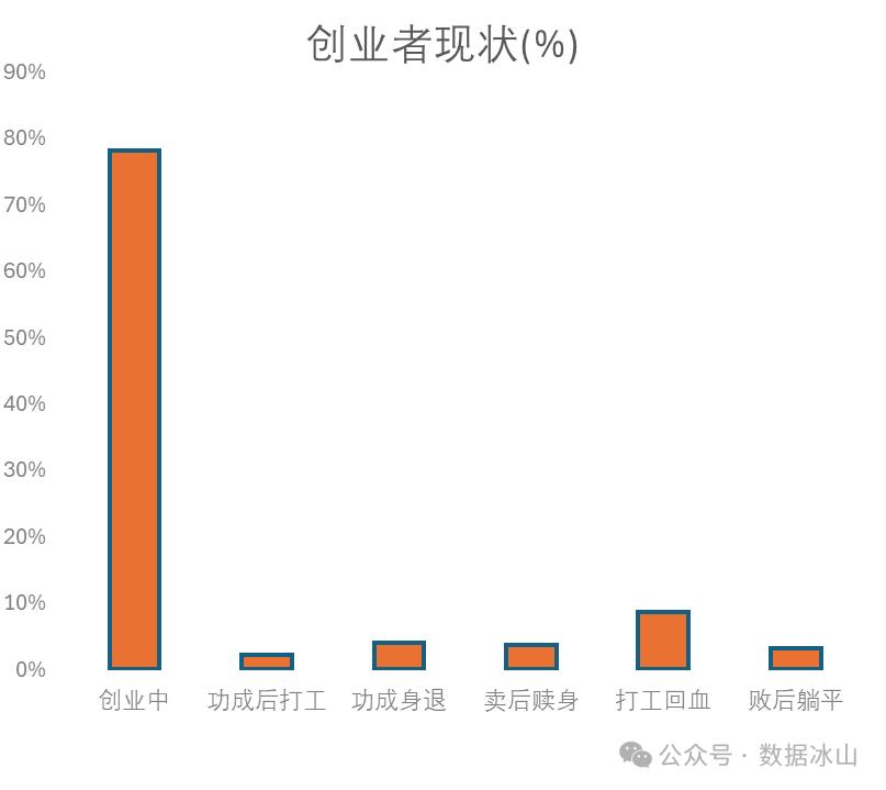 有创业经验的朋友(以前简称创业者),78%还在创业。剩下的企业家有两种:一种是创业取得了一定的成绩,另一种是创业但失败退出。