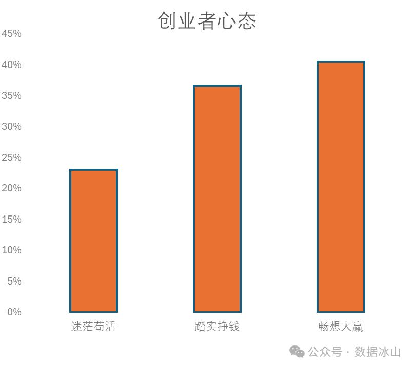 总的来说,虽然这群企业家喊着没有机会或者平躺着度过残生,但他们拒绝诚实,93%的企业家还处于加入世贸组织的状态,只有7%的企业家出生(功成身退和败后平躺的总数)。