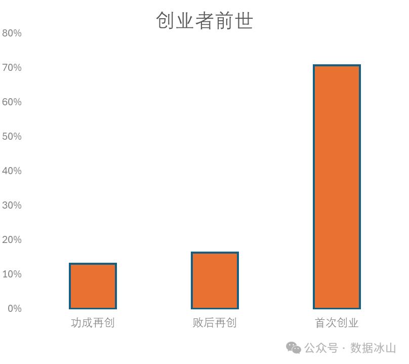 从前世的角度来看,68%的创业者是第一次创业,但其实很多都是第一次坚持多年;17%是失败后再创造,永不放弃;15%是成功后再创造,努力进一步做大做强。