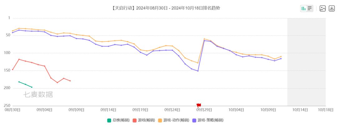 商品的后续发展也如市场预期的那样。游戏上线才10天,《天启行动》就在iOS热销榜上消失了。虽然9月底商品也有逆势上涨的趋势,但《天启行动》很难有效应对首发红利的损失,商品最终很快被归类为安静。
