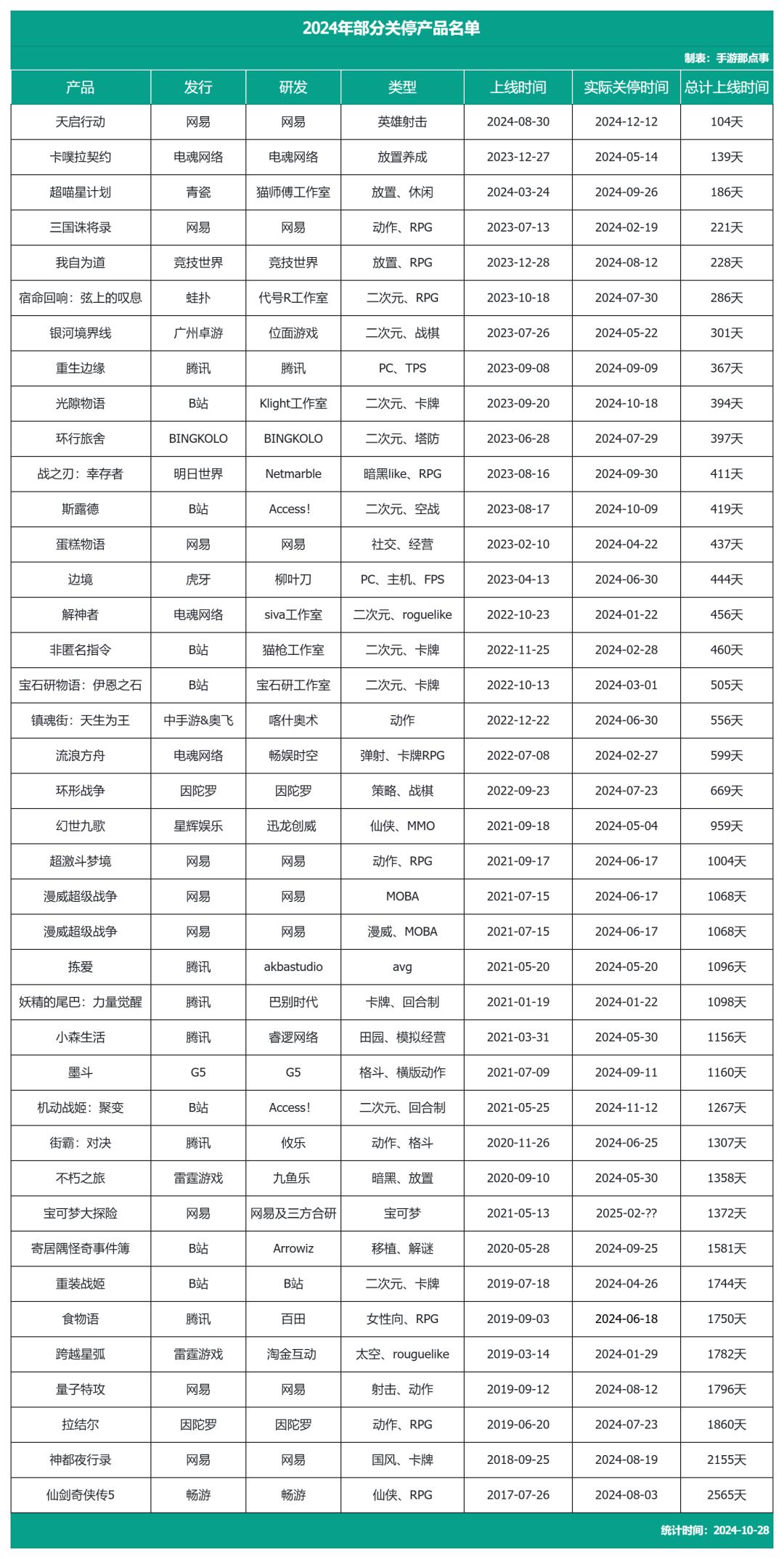 这种现象也让我更加好奇。2024年有多少产品是“创业前半途而废”?还有多少种游戏是“名利双收”?为了解决这个疑问,手机游戏并没有完全统计出2024年40款宣布停运或正式停运的产品名单。借此机会,我们也来说说2024年这波停运潮的背后,反映了行业目前的困境。