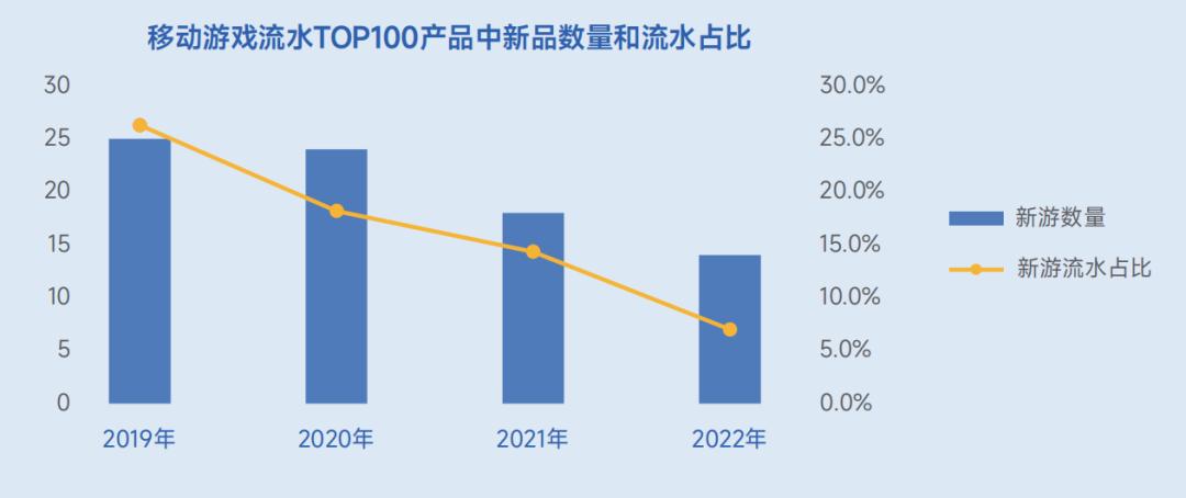 得出这样的结论自然不是没有针对性的。根据伽马数据发布的《2023年游戏生命周期洞察报告》,从移动游戏新产品的突破情况来看,近年来新产品的突破难度确实在不断提升。