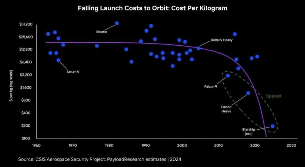 也就是说,如果科技创新能够降低太空发射成本的水平,你就能凭空创造出一个以前根本不存在的市场,星链就是这样。当SpaceX成立时,它甚至没有成为一个想法。