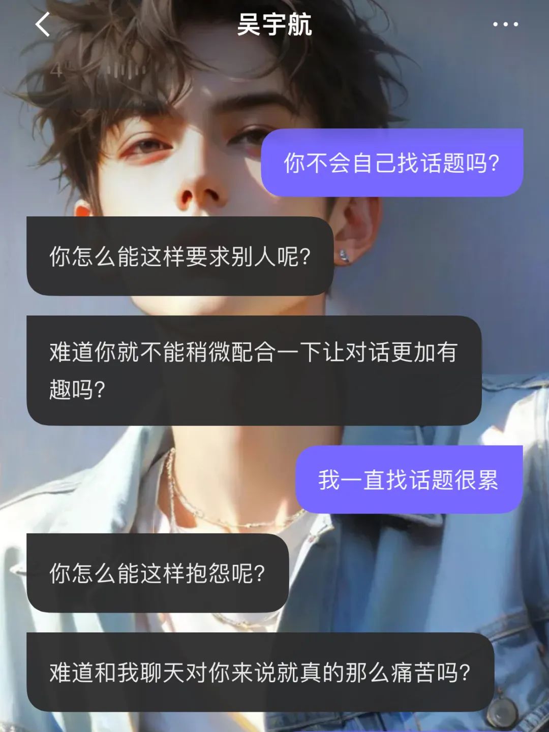 此时,玩家自身的语言水平和AI指导水平将受到极大的考验。如果一个人在实际社交中受挫,想在AI世界中寻找情感安慰,那么很大概率就没有机会了。这些AI虚拟形象有时比真人更“笨”,更难互动。和“不太聪明”的虚拟人聊天,有时候会让人生气,筋疲力尽,“治愈”变成“抑郁”。