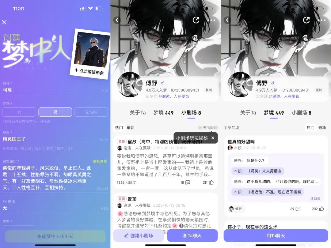 以建造梦岛为例,基于虚拟图像,用户可以在「梦境」功能部分主动分享自己这个角色的精彩对话;「剧场」功能性板块,可以为梦中人补充创作故事或情节,其他客户玩家选择随意导入剧场后也可以根据剧场设置继续聊天。