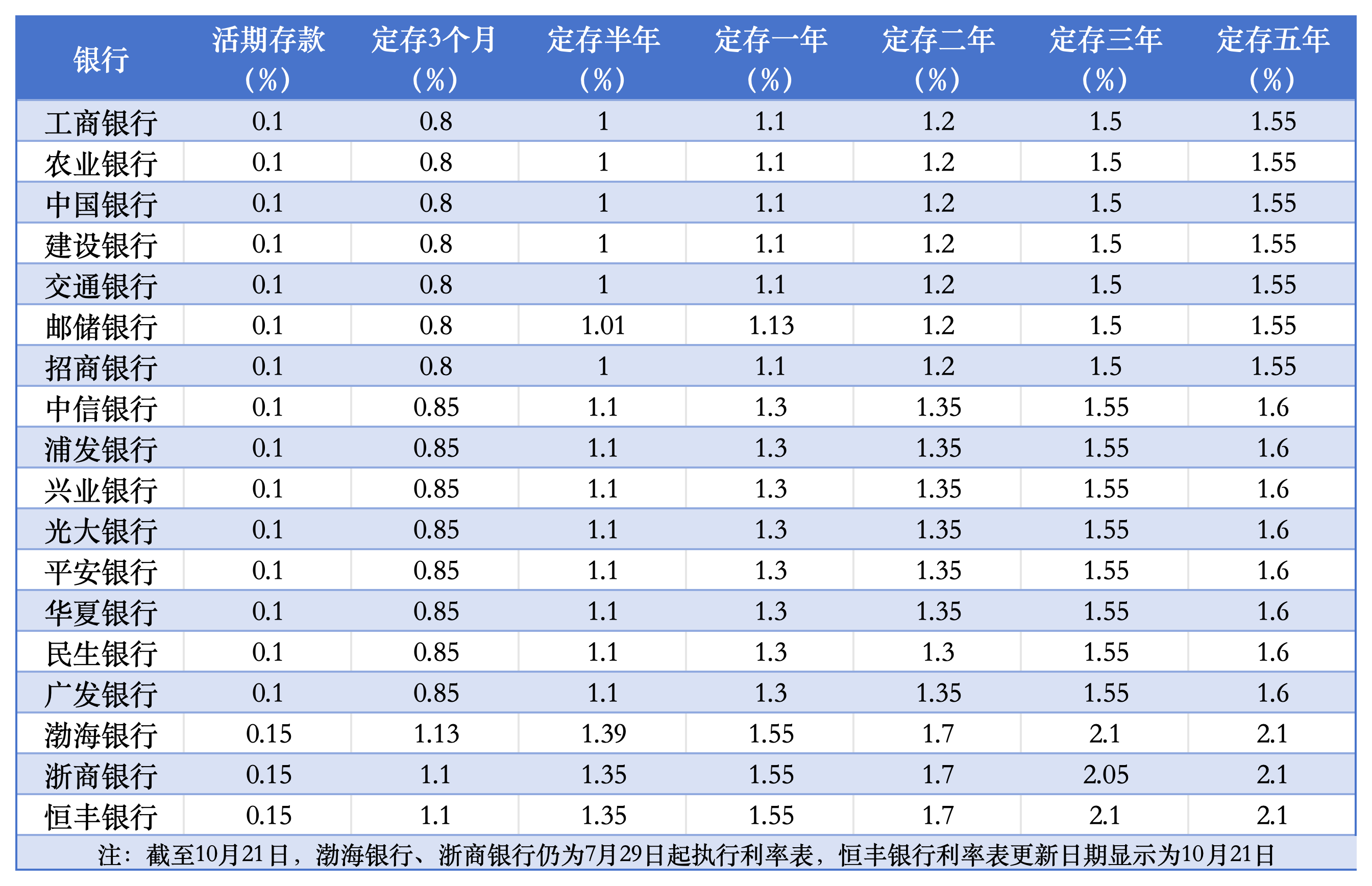从10月18日开始,大部分股份制银行都跟进了国有银行,对不同品种的存款利率进行了新一轮的调整。其中,招商银行18日与大银行同步调整,平安银行19日更新利率表。21日,中信银行、浦东发展银行、兴业银行、光大银行、华夏银行、民生银行、广发银行更新利率表。其他,恒丰银行、浙商银行、渤海银行还没有跟进。