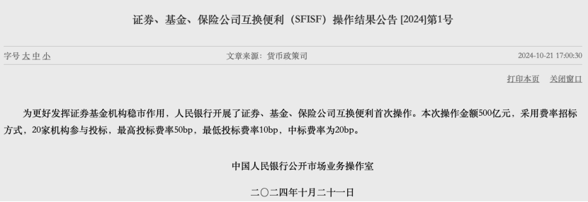 十月二十一日下午,央行宣布,首次进行了证券、基金、保险公司互换便利(以下简称“互换便利”)。此次操作额度为500亿元。20家机构通过使用费率投标方式参与投标,最高投标费率为50bp,最低投标费率为10bp,中标费率为20bp。