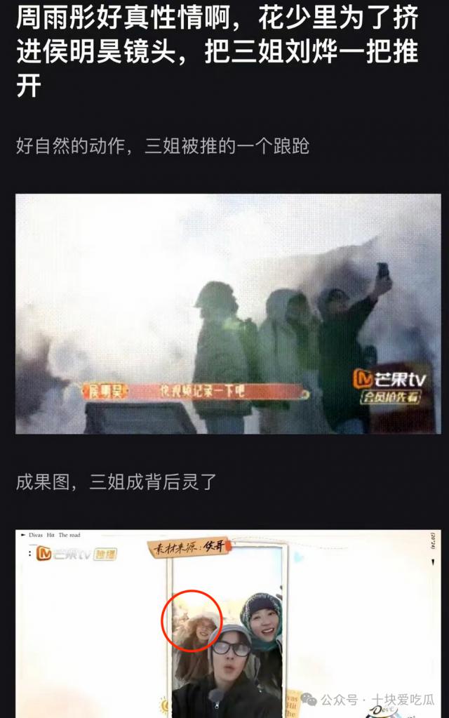 依然是拍照阶段,原本是周雨彤、侯明昊、刘烨三人一起出现,期间刘烨已找到了一个好位置。 摆好 pose,但是周雨彤却把它推开了。