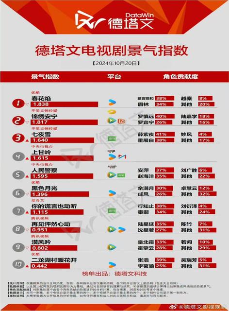 德塔文公布了最新的电视剧景气指数排行榜!前三部是古装剧,分别是《春花焰》、《锦绣安宁》和《七夜雪》。古装剧的主题蓬勃发展,前三部在关注度上与后三部作品有一定差距。