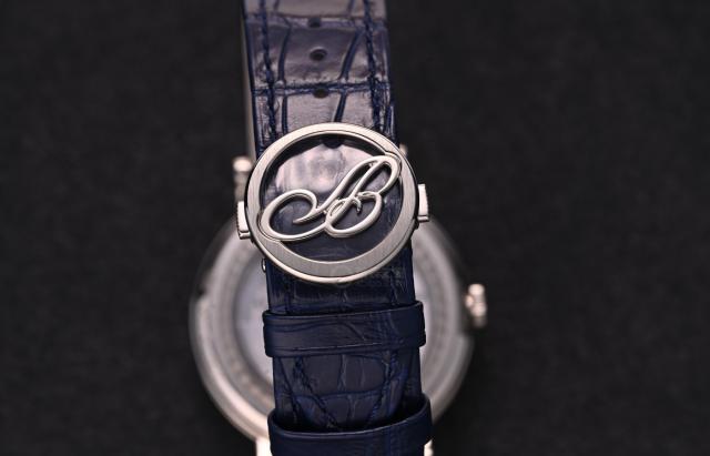 搭配蓝色腰带和铂金腰带。 logo 折叠表扣,宝玑传统和经典再次呈现。(图片 / 文 腕表之家 YIYI)