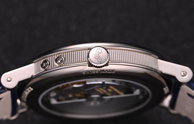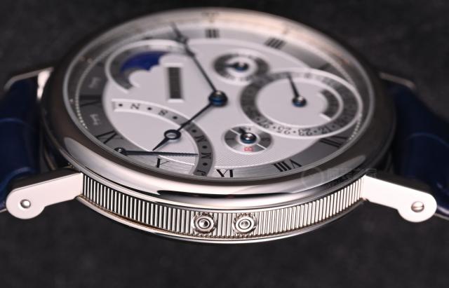 虽然功能复杂,但校准并不复杂。时间的校准可以通过表把进行调整,其他功能可以通过表壳外侧的各种功能调整器进行调整。4 点位校准日期,4-5 点位校准月相,6 点位校准日期,9 点位校准月份和年份。隐藏在装饰有优雅硬币纹的表壳上,充分优雅。