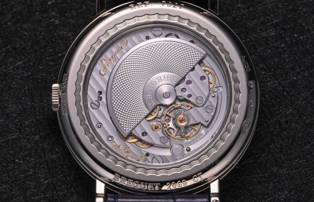 只要你旋转手表,你就会被如此美丽的运动所震撼。蓝宝石后盖玻璃的外围用波浪形装饰,极其美观高档。手工圆形大麦装饰用金自动陀装饰,夹板用日内瓦波纹装饰倒角,即使是看不见的细节也被惊喜打磨装饰。虽然整体装修比较简单,没有那么华丽,但在细节上总能看到宝玑的严肃态度。