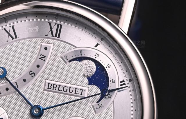 铂金表壳18K组合 39 9.13毫米的表径 mm厚度,整体比例非常适中,类似于上一代,非常经典。蓝钢宝玑指针、机械雕刻花卉图案等品牌标准在镀银金表盘上再次持续。整体布局合理清晰。从顺时针的角度来看,分别是月相显示、星期显示、日期显示和年份显示(红色字母 B 表示闰年)、月反弹显示。
