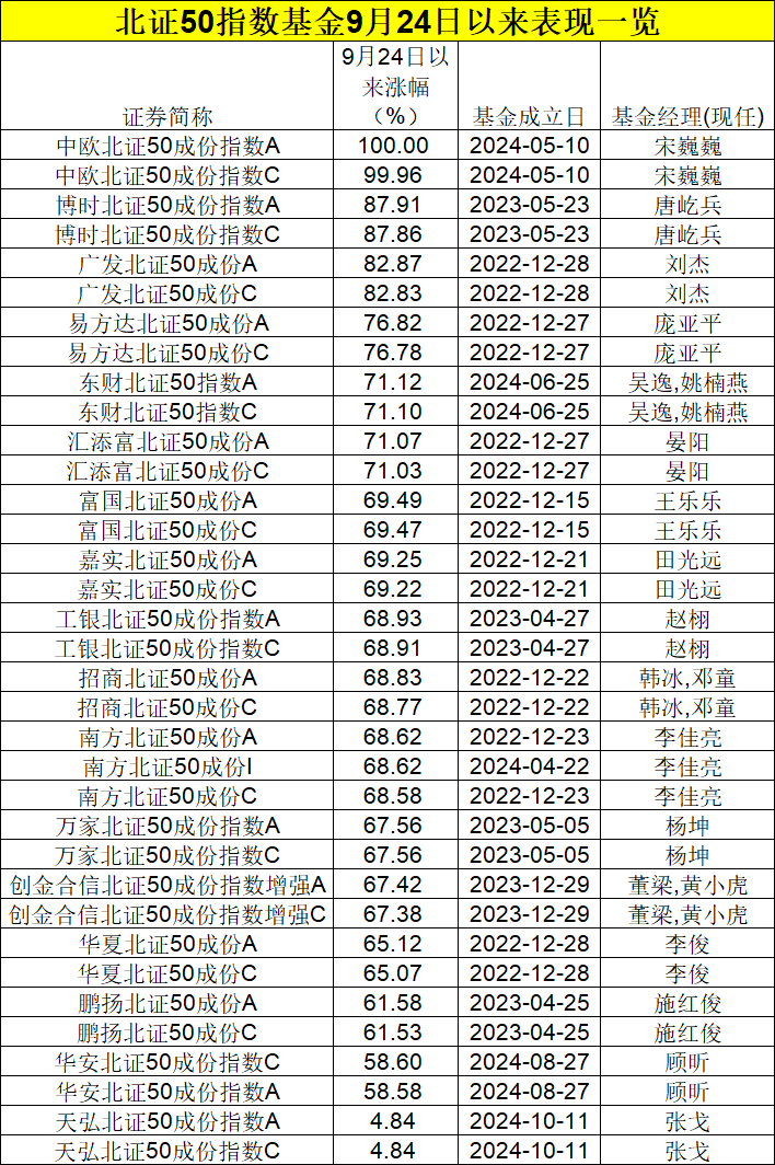 另外,截至十月二十日,博时北证50日、广发北证50、易方达北证50、东财北证50、自9月24日以来,汇添富北证50等基金也上涨了70%以上。