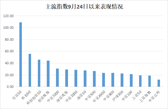 更引起市场关注的是,自9月24日推出一系列超出预期的“组合拳”政策以来,北证50指数在短短15个交易日内翻了一番,成为主流指数中的“领头羊”。