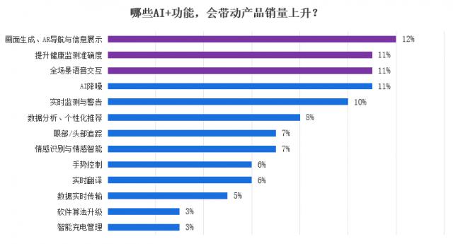 AI 该技术广泛应用于可穿戴设备领域,在终端应用中,AI 技术的加持带来了 AI 降低噪音,实时翻译,实时数据传输,智能充电管理等功能。那么,哪些 AI 功能性,会带动产品销量上升?经过电子爱好者的调查,工程师们普遍认为 AI 技术加持带来的场景生成,AR 通过导航和信息展示,提高健康监测的准确性,全场景语音交互将加速可穿戴设备产品销售的增长。