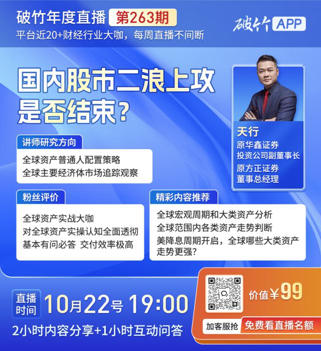 今晚 7 点击,在破竹直播间,我们特别邀请了实战全球资产配置。 V “天行总”亲临破竹直播间,带给大家。——国内股市二浪拉涨是否结束?