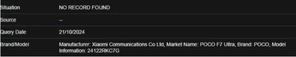 【CNMO 近日,科技新闻:CNMO 注意到,根据 IMEI 最新的数据库记录,一个名字叫做 POCO F7 Ultra 新机器已悄然出现,其型号为 24122RKC7G。有趣的是,POCO F7 Ultra 型号和红米 K80 这个暗示完全一致 POCO F7 Ultra 可能是红米 K80 改名换壳版本。
