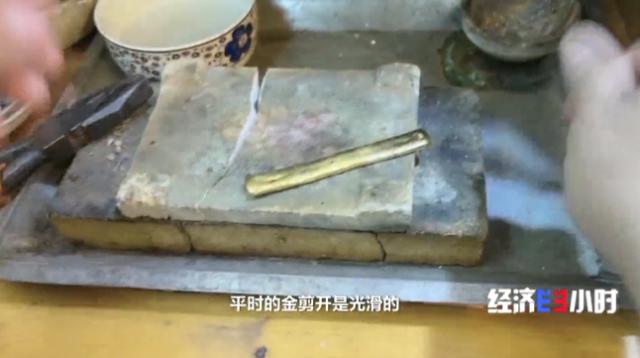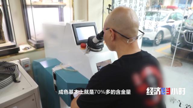 金铺店主 陈女士:当用整个链条测量时,我们看不到它。链子熔化烧制后,我们用剪刀剪开,一眼就能看出它和平时的黄金不一样。平时的金剪是光滑的,这是颗粒状的,是用来测量颜色的。 70% 多含金量。