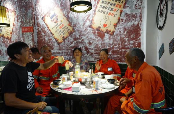 邀请环卫工人吃火锅。