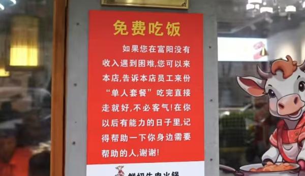店门口有一个显眼的红色通知:如果你在富阳没有收入,遇到困难,可以来我们店,告诉我们的员工来一个“单人套餐”。吃完就直接走,不用礼貌!