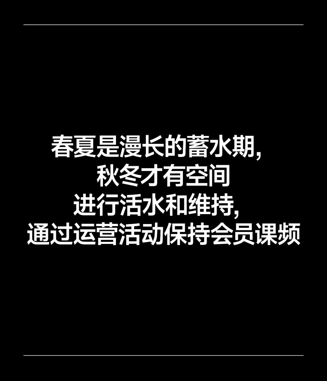 体育产业立冬并非突发事件,春夏是漫长的蓄水期,秋冬有空间进行活水和维护,通过运营活动维持会员课频。