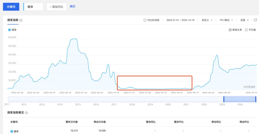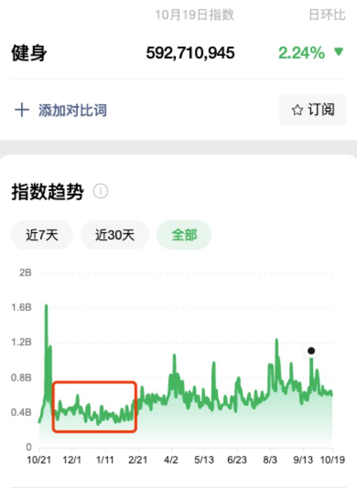 这种情况在社交平台上也有明显的体现。小红书#见人不如健身。 话题进入10月后迅速下降。回顾往年的数据,无论是小红书、微信指数还是搜索指数,健身相关话题的人气都会在10月至次年2月进入低谷。春节过后,他们将进入健身高峰,春天气温回暖后,他们将逐渐上升。