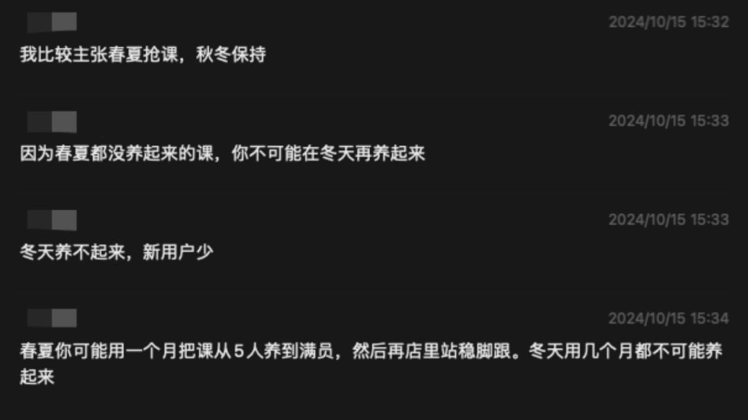 在接受精炼GymSquare采访时,很多北京健身房也表示,(北方)体育行业通常在10月份进入淡季,ZOYO佐佑同行综合体能训练馆创始人@左浩 提到北方气候变化明显,健身淡季通常从10月到明年2月进入,会员出勤率下降,新增访客数据也在下降。某连锁健身品牌私人教练@林教练 提到,冬季约课数量减少,大约10%的收入减少。
