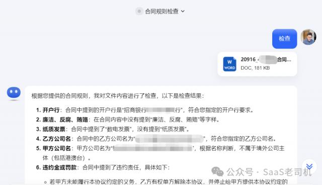 与此同时,我也用它来审批一些工作合同,告诉它审批规则,把合同文件发给合同文件 AI 做检查,比人工检查更有效率,而且不容易出错。