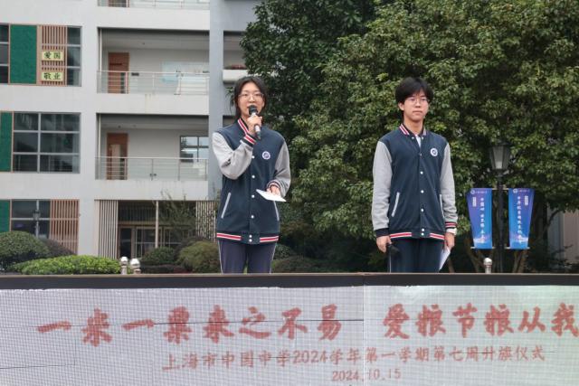 中国中学上海市 2024 学年第一学期第七周升旗仪式也在世界粮食日前夕举行。自古以来,中华民族就有“人以食为天”的说法,深刻诠释了粮食在生活中的重要地位。升旗仪式上,同学们用自己的感受分享,传达了“一米一粟来之不易,爱粮节粮从我做起”的理念。
