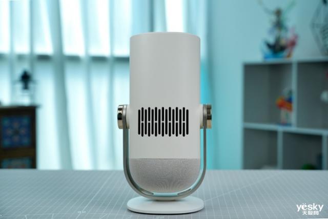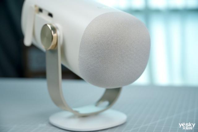 Smart 1 圆筒机身的后部是内置音响,由网布包裹,6W。 音箱结合 AI 低音增强算法提供专业的音频体验。投影还支持蓝牙连接,待机时可变身蓝牙音响,扩展随意感受。