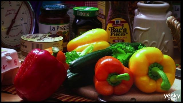 在色彩氧化方面,选择果蔬图进行观察,可以看出色彩较为自然,过渡顺畅,表面高光,水滴,纹理等细节丰富。