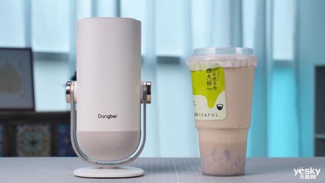 身材也是影响便携性的因素,考虑到当贝 Smart 1 从形状到配色都像一杯奶茶,我们特意准备了一个直观的对比。可以看出,当贝贝 Smart 1 排除一体式云台后的机身本身,基本上和一杯 1L 装超大杯的奶茶身材相似,的确可以说是当贝。 Smart 1 这是一个便携式的奶茶杯大小投影。
