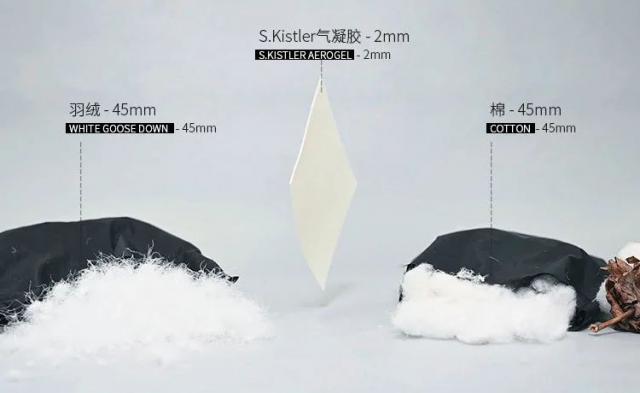 在保暖性能相同的前提下,气凝胶只有白鹅绒。 1/3 薄厚。
