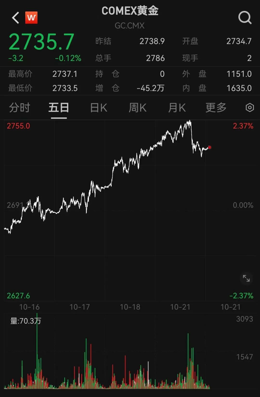 COMEX 十二月份黄金期货盘涨至2755.40美元,创历史新高,但随后暴跌,最终收涨0.17%至2734.70美元/盎司。目前,它位于2735.7美元/盎司周围。