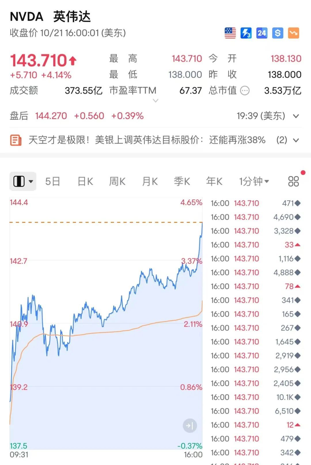 美东时间10月21日,英伟达大幅上涨4%以上,报143.71美元,再创历史新高。英伟达最新总市值达到3.53亿美元,直追苹果。
