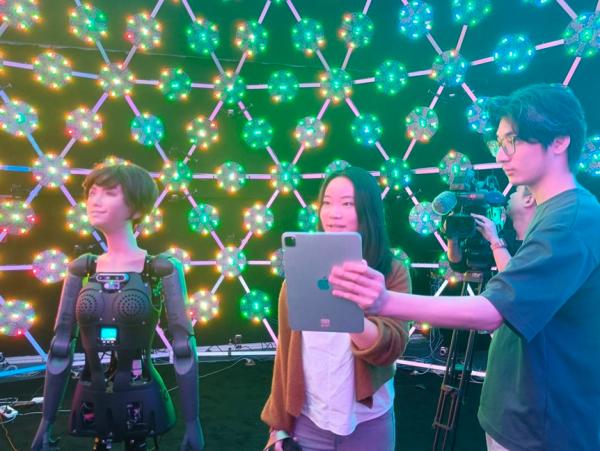 一款全智能机器人模型“索菲亚”在上科大信息学院MARS实验室中展示了自己的演唱技巧。