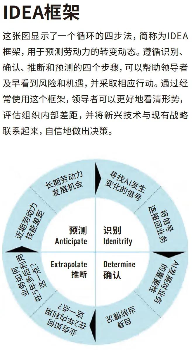 劳动力变化是技术发展带来的不可避免的副作用,领导者在生成式AI发展后需要系统地对待组织。因此,这个简单的框架可以帮助领导者预测劳动力需要什么,什么时候改变,从而发挥AI的杠杆作用。这里的目标不是做长期预测,而是让组织在AI不断进化的过程中做好充分的准备(见“IDEA框架”图)。