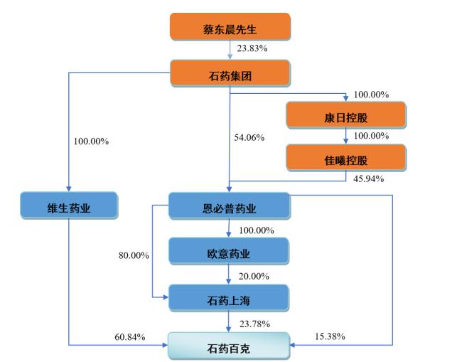 现在石药百克的股权结构是维生药的60.84%、上海石药持仓23.78%、恩必普医药持仓15.38%。蔡东晨是石药百克的实际控制人,通过石药集团控制上海的维生药、恩必普药和石药。
