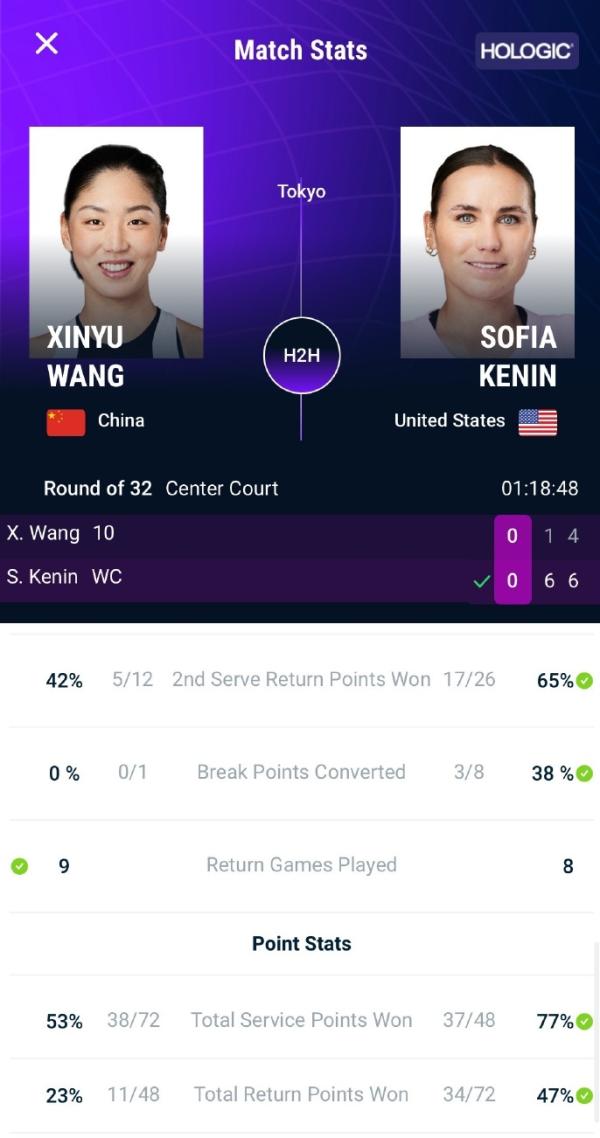 中国金花王欣瑜在北京时间10月22日,WTA500东京站首轮比赛中亮相。