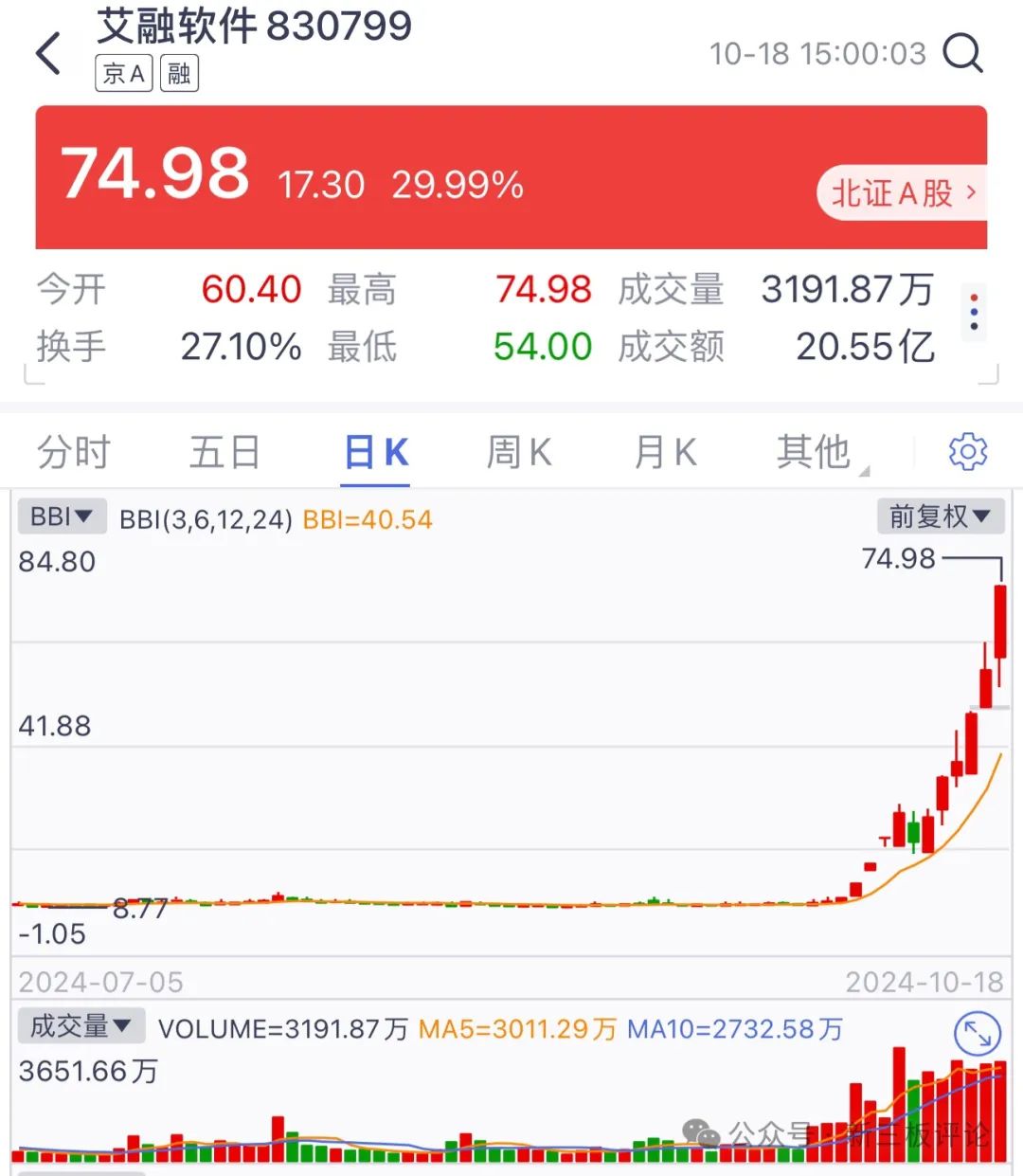 从艾融软件9月24日盘中最低价9.10元开始,到10月18日收盘价74.98元,共14个交易日累计涨幅高达723.96%,如果把9月24日国新办“金融支持经济高质量发展”新闻发布会作为这波行情的开始日。