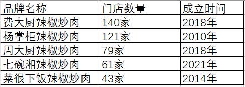 窄门餐眼数据显示,辣椒炒肉跑道TOP5品牌为费厨师,杨掌柜,周厨师,七碗湘菜,菜很好吃。,现有门店数量分别为140家、121家、79家、61家、43家。