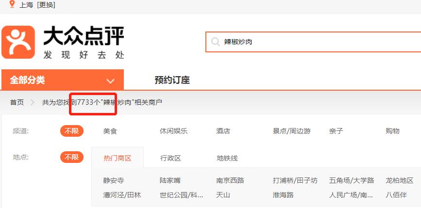 而上海大众点评搜索“辣椒炒肉”,显示有7733家相关商家。,在这些人中,只有大厨辣椒炒肉在上海给出25家。